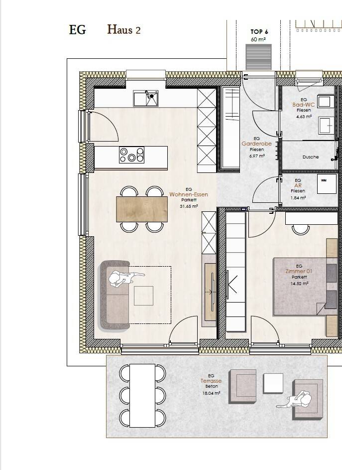 Diese Erdgeschosswohnung (TOP 6) bietet Ihnen ca. 60 m² Wohnfläche und besticht durch ihre durchdachte Raumaufteilung sowie eine hochwertige Ausstattung. Die süd-west-nordseitige Ausrichtung sorgt für eine herrliche Lichtdurchflutung, während die ca. 18 m² große südseitige Terrasse ein perfekter Ort ist, um die Sonne und die frische Luft zu genießen. Raumaufteilung •Garderobe •Badezimmer: Modernes Bad mit Dusche, WC und Fenster •Abstellraum •Wohn-Ess-Küchenbereich: Ein offener und großzügig gestalteter Raum, der sowohl zum Kochen als auch zum Verweilen einlädt. Von hier aus haben Sie direkten Zugang zur ca. 18 m² großen, südseitigen Terrasse •Schlafzimmer: Ein einladendes Schlafzimmer mit direktem Zugang zur Terrasse. •Kellerabteil •Carportstellplatz (optional ) (die in den Visualisierungen dargestellten Einrichtungsgegenstände, Texturen und Oberflächen dienen der Illustration. Bepflanzungen und Möbel sind nicht im Kaufpreis enthalten)Energieausweis